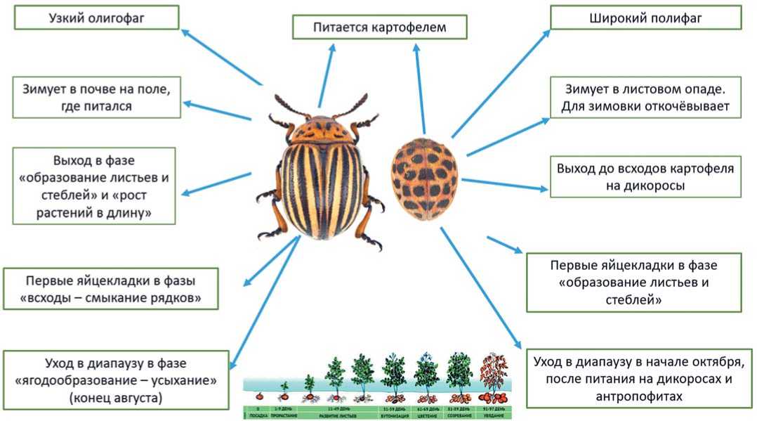 Исследования фенологии колорадского жука показали, что в южных районах Приморского края выход жуков из почвы весной наблюдается в период начала вегетации картофеля, а в северных – в начале бутонизации. На юге Приморья выход первых перезимовавших жуков отмечается в третьей декаде мая, а интенсивное отрождение начинается при прогревании воздуха до +20°C и выше, и продолжается, как правило, в течение 6-9 дней. В Приморье период яйцекладки у колорадского жука очень продолжителен и длится до середины августа. Интенсивность яйцекладки зависит главным образом от температуры. Холодная погода со средней температурой +18°C заметно тормозит откладку яиц [12]. Наивысшая интенсивность яйцекладки совпадает с периодом самых длинных дней. В условиях Приморья это отмечается сразу после выхода жуков из зимовки, в конце мая – начале июня. Молодые самки первой генерации откладывают яйца, из которых развивается второе поколение фитофага, которое в Приморском крае закончить свое развитие не успевает. По нашим многолетним наблюдениям, фенология вредителя связана со сроками вегетации картофеля, что также является существенным отличием от картофельной коровки. Массовый уход имаго в диапаузу может наблюдаться уже в начале августа, когда листья картофеля поражаются грибными и псевдогрибными болезнями, что приводит к усыханию кустов, в то время как картофельная коровка продолжает своё питание на бахчевых культурах, других растениях семейства пас-