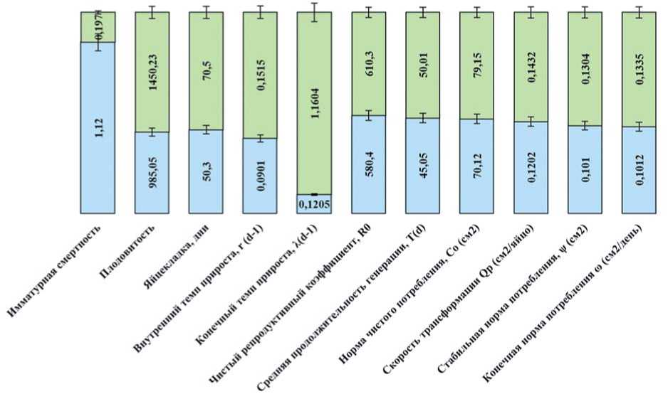 Fig. 3. Population parameters of the original samples of the potato ladybird beetle and the Colorado potato beetle (2008-2012) (cited from Matsishina et al., 2023)