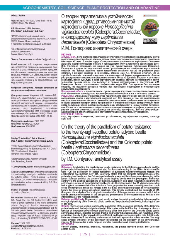 Актуальность. Установление параллелизма устойчивости картофеля к колорадскому жуку и картофельной коровке было важным этапом для отечественного селекционного процесса в 60-е годы XX века. В своём труде «О параллелизме устойчивости картофеля к эпиляхне Epilachna vigintioctomaculata Motsch) и колорадскому жуку (Leptinotarsa decemlineata Say)» И.М. Гонтюров утверждал, не взирая на уже существующие публикации Ивановой, Куренцова и других исследователей, прямо указывающих на полифагию картофельной коровки, что полное развитие обоих вредителей возможно только на растениях рода Solanum, а личинки коровки не многоядны. Однако, еще А.И. Куренцов отмечал, что H. vigintioctomaculata типичный представитель маньчжурской фауны, приуроченный к области распространения смешанных и широколиственных лесов на Дальнем Востоке, и до начала земледельческой культуры в крае картофельная коровка обитала на травянистой растительности лесных полян, что вступает в прямое противоречие с постулатами И.М. Гонтюрова. Анализ экологических особенностей видов И.М. Гонтюровым был проведен неверно, что повлекло досадные ошибки при постановке, проведении и интерпретации результатов эксперимента. Цель данной работы – провести анализ существующих подходов к определению экологической валентности колорадского жука и картофельной коровки, в т.ч. и по нашим данным. Результаты. Описываемого в литературе параллелизма экологических валентностей между колорадским жуком и картофельной коровкой нет. Это связано с тем, что картофельная коровка значительно отличается своими биоэкологическими особенностями от колорадского жука: широкий полифаг, смена трофической и зимовочной стаций, саморегуляций плотности популяции, более высокие репродуктивный коэффициент и норма чистого потребления. Кроме того, значительно отличаются сортовые предпочтения картофеля, что говорит о разном влиянии вторичных метаболитов на онтогенез фитофагов. Всё это обеспечивает широкий фронт работ сотрудникам соответствующих селекционных учреждений.