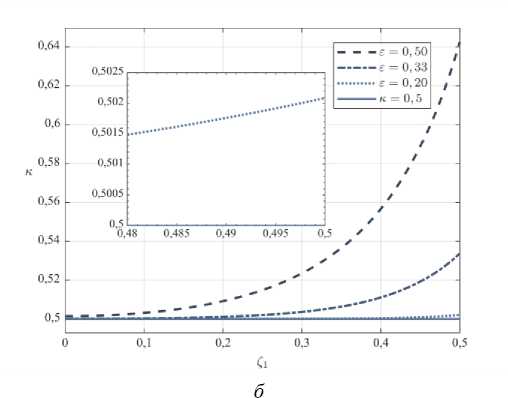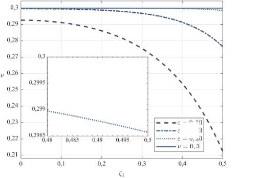 Для проверки работоспособности формул (14) проведен численный эксперимент. На рис. 3 приведены результаты восстановления точных параметров v = 0,3; к = 0,5 по формулам (14) при Zi е ( 0,0,5 ) . Видно, что работоспособность формул (14) сильно зависит от параметра относительной толщины ε. Для сильно вытянутых образцов (ε = 0,2) параметры восстанавливаются практически точно. Если ε > 0,2 , то для использования формул (14) рекомендуется выбирать точки измерения в диапазоне Zi е ( 0,0,1 ) для минимизации ошибок восстановления параметров.