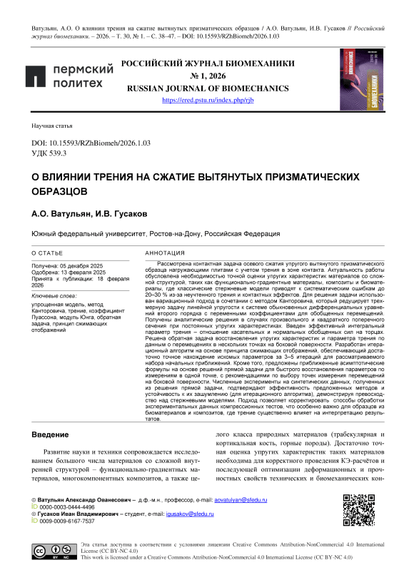 Однако все вышеперечисленные модели и результаты в основном ограничены цилиндрической геометрией. Призматическая геометрия особенно актуальна для образцов из биоматериалов, таких как трабекулярная кость, где образцы часто вырезают в форме прямоугольных призм для минимизации артефактов подготовки и удобства фиксации в испытательном оборудовании [7]. Для нецилиндрических форм аналитические решения редки и часто заменяются численными методами. Настоящая работа восполняет этот пробел. Рассмотрена контактная задача осевого сжатия призматического образца жесткими плитами с учетом трения. Вариационный подход в сочетании с методом Канторовича позволяет редуцировать рассматриваемую задачу к краевой задаче для системы обыкновенных дифференциальных уравнений для обобщенных перемещений. На этой основе решены прямая задача (распределение напряжений и деформаций) и обратная (восстановление упругих характеристик и параметра трения). Для обратной задачи предложен итерационный алгоритм на основе принципа сжимающих отображений. Подход обеспечивает низкозатратные вычисления по сравнению с КЭ-симуляциями, что полезно для обработки серий экспериментов для образцов из твердых биоматериалов. Также для обратной задачи предложены простые приближенные формулы для быстрой оценки упругих характеристик и параметра трения. Таким образом, работа вносит вклад в аналитические модели, позволяя учитывать трение и восстанавливать параметры для вытянутых призматических образцов в рамках контактного сжатия.