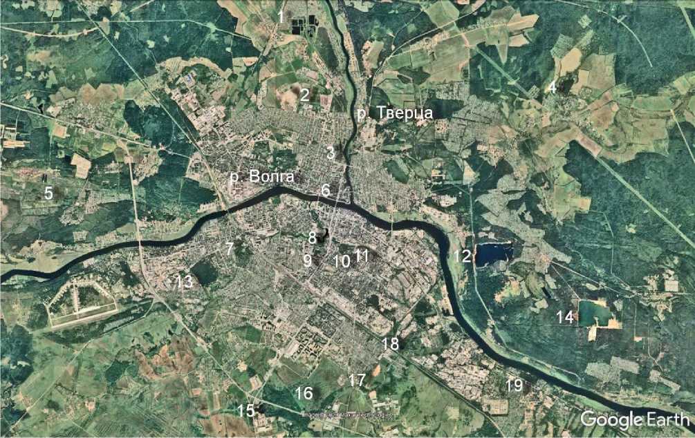 Рис. 1. Некоторые места наблюдений в Твери и её ближайших окрестностях.