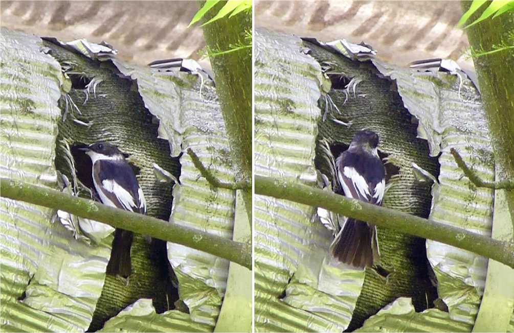 Рис. 12. Гибридный самец мухоловки-белошейки Ficedula albicollis и мухоловки-пеструшки F. hypoleuca у входа в гнездо. Сквер у ДК «Металлист». Заволжский район Твери. 24 мая 2025. Фото А.А.Виноградова