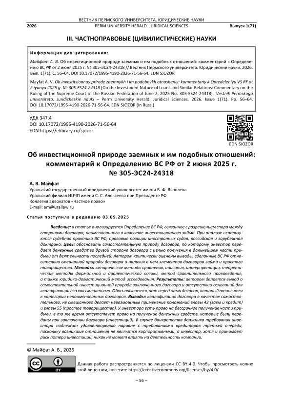 Введение: в статье анализируется Определение ВС РФ, связанное с разрешением спора между сторонами договора, поименованного в качестве инвестиционного займа. При анализе используются судебная практика ВС РФ, правовые позиции иностранных судов, российская и зарубежная доктрина. Цель: обосновать самостоятельную природу договора, по которому инвестор передает денежные средства другой стороне договора с целью получения в дальнейшем части прибыли от деятельности последней. Автором критически оценены выводы, сделанные ВС РФ относительно смешанной природы договора и наличия в нем элементов договоров займа и простого товарищества. Методы: эмпирические методы сравнения, описания, интерпретации; теоретические методы формальной и диалектической логики, метод сравнительного правоведения, а также юридико-догматический метод исследования. Результаты: автором делается вывод о самостоятельной инвестиционной природе заключенного договора и отсутствии оснований для квалификации его как смешанного. Обосновывается, что перед нами договор, который относится к категории непоименованных договоров. Выводы: квалификация договора в качестве самостоятельного, не смешанного делает невозможным применение положений главы 42 (заем и кредит) и главы 55 (простое товарищество). У инвестора есть право на бессрочное получение части прибыли, в то же время отсутствует право на получение денежных средств, которые были переданы при заключении договора (инвестиций). В случае банкротства должника требования инвестора подлежат удовлетворению наравне с требованиями кредиторов третьей очереди, поскольку возникшие отношения не являются корпоративными, а инвестор, хотя и принимает риск потери инвестиций, никак не может влиять на деятельность компании.