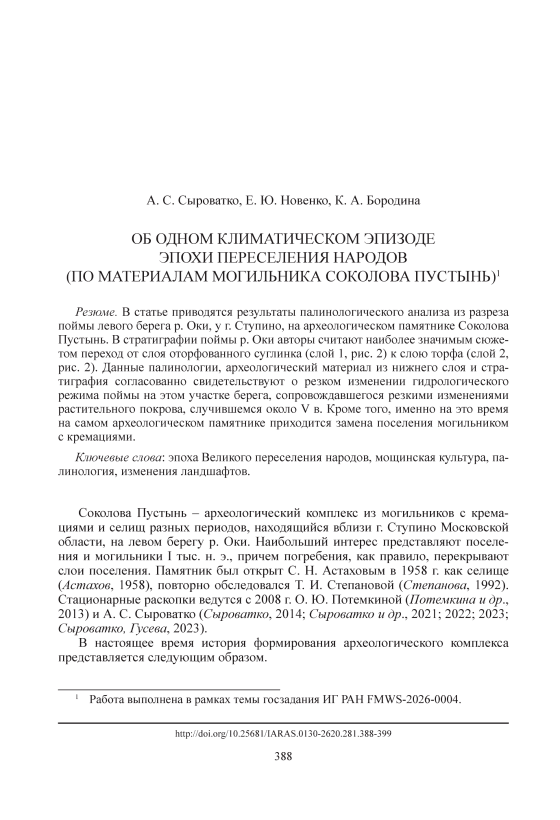 В статье приводятся результаты палинологического анализа из разреза поймы левого берега р. Оки, у г. Ступино, на археологическом памятнике Соколова Пустынь. В стратиграфии поймы р. Оки авторы считают наиболее значимым сюжетом переход от слоя оторфованного суглинка (слой 1, рис. 2) к слою торфа (слой 2, рис. 2). Данные палинологии, археологический материал из нижнего слоя и стратиграфия согласованно свидетельствуют о резком изменении гидрологического режима поймы на этом участке берега, сопровождавшегося резкими изменениями растительного покрова, случившемся около V в. Кроме того, именно на это время на самом археологическом памятнике приходится замена поселения могильником с кремациями.