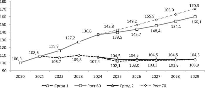 В случае реализации данного сценария для достижения к 2030 году 60 % от уровня 2020-го, по оценке автора, в 2028–2029 годах достаточно темпов роста инвестиций на уровне 103,8–103,9 % (линия «Сргод 1» на рис. 1), что примерно соответствует среднегодовым темпам роста инвестиций в основной капитал в Российской Федерации за последние 15 лет (в 2010–2024 гг. – 103,7 %). Для достижения 70 % от уровня 2020 года необходим ежегодный рост инвестиций в размере 104,5 % с 2025 по 2029 год («Сргод 2»), что на 0,8 % выше динамики 2010–2024 годов, но существенно ниже среднегодовой динамики 2020–2024 годов. Тогда к 2030 году объем инвестиций может вырасти относительно 2020 года до уровня 100 %, или в два раза в сопоставимых ценах, что является реалистичным сценарием в силу наличия у России внутреннего инвестиционного потенциала в виде ресурсных и производственных возможностей (Буданов и Устинов, 2025, с. 198).
