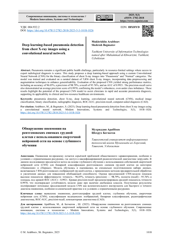 Пневмония по-прежнему остается серьёзной проблемой общественного здравоохранения, особенно в условиях с ограниченными ресурсами, где доступ к квалифицированной радиологической диагностике затруднён. В данном исследовании предлагается метод на основе глубинного обучения с использованием собственной сверточной нейронной сети (CNN) для бинарной классификации рентгеновских снимков грудной клетки на категории «Пневмония» и «Нормал». Модель обучалась и оценивалась на специально подготовленном наборе данных, включающем 5 856 рентгеновских изображений грудной клетки, с применением методов предварительной обработки и увеличения данных для повышения обобщающей способности. Оценка предложенной CNN-модели показала высокие показатели эффективности: точность - 96,05%, точность (precision) — 98,79%, полнота (recall) - 95,76% и площадь под кривой ROC (AUC) - 0,9921. Кривая precision-recall продемонстрировала средний показатель точности 0,9970, что подтверждает устойчивость модели даже при наличии дисбаланса классов. Полученные результаты подчёркивают потенциал предложенной модели CNN как вспомогательного инструмента для быстрого и точного диагноза пневмонии, особенно в клинической практике и в условиях с ограниченными ресурсами.