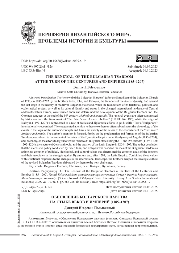 Индексируется в: SCImago Journal & Country Rank Web of Science Scopus Научная электронная библиотека (РИНЦ) ULRICHSWEB™ Global Serials Direсtory Google Scholar Научная электронная библиотека «Киберленинка» Соционет Электронно-библиотечная система «Университетская библиотека онлайн» Электронно библиотечная система IPRbooks MIAR (Barcelona) Catálogo colectivo COPAC (Reino Unido) ZDB (Zeitschriftendatenbank) OCLC WorldCat ROAD (Directory of Open Access Scholarly Resources) ResearchBib Directory of Open Access Journals CrossRef Sherpa Romeo ProQuest SSOAR (Social Science Open Access Repository) Global Impact Factor Genamics JournalSeek Электронно-библиотечная система Znanium ПОЛЫВЯННЫЙ Д.И. Обновление Болгарского царства на стыке веков и империй (1185–1207) Просмотров: 8 item->id; ?> DOI: https://doi.org/10.15688/jvolsu4.2025.6.19 Дмитрий Игоревич Полывянный, доктор исторических наук, профессор, руководитель Научно-образовательного центра интеграции науки и образования, Ивановский государственный университет, ул. Ермака, 39, 153025 г. Иваново, Российская Федерация, dipol53@mail.ru, https://orcid.org/0000-0003-3680-5508 Аннотация. Введение. «Обновление Болгарского царства» (согласно Синодику Болгарской церкви 1211 г.) в 1185–1207 гг. основателями династии Асеней братьями Петром, Иоанном и Калояном открыло последний этап в истории средневековой болгарской государственности, когда основы территориальной, политической и церковной системы, а также культурной самобытности и статуса Болгарии в изменявшемся международном ландшафте Центральной и Юго-Восточной Европы формировались заново и определяли развитие Болгарского царства до османского завоевания. Методы и материалы. В литературе эти события нередко сжимаются до «восстания Петра и Асеня» (1185/1186–1190), а правление Калояна (1197–1207) представляется чередой сражений и дипломатических усилий, направленных на международное признание его царского титула. Преувеличенное внимание к этим двум темам подчиняет хронологию событий логике авторских концепций и ограничивает разнообразие действующих лиц персонажами «первого ряда». Анализ и выводы. Внимание автора сосредоточено, во-первых, на провозглашении и становлении Болгарского царства, рассматриваемого в контексте кризиса Византийской империи при династии Ангелов (1185–1204), и, во-вторых, на попытках Асеней легитимизировать обновленное болгарское государство во время III и IV крестовых походов (1189–1190; 1202–1204), взятия Константинополя и создания Латинской империи в 1204–1207 годах. Автор приходит к выводу, что последовательная политика, проводимая Петром, Иоанном и Калояном, была основана на представлении о Болгарском царстве как вневременном комплексе политических, идеологических и культурных ценностей, определявшим общие цели братьев и их единомышленников в борьбе против Византийской, а затем – Латинской империй. В сочетании с ситуационным реагированием эти ценности составляли стратегическую культуру обновленного братьями Болгарского царства, адаптированную к новым вызовам.