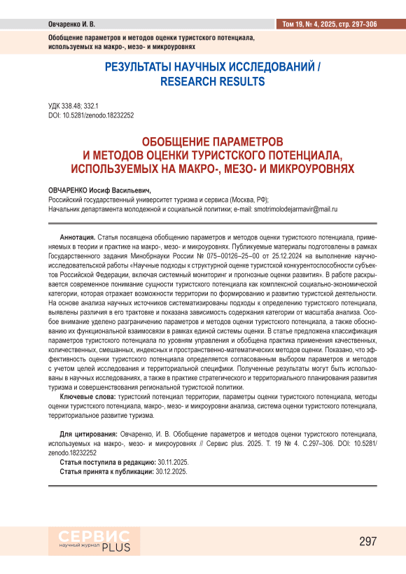 Статья посвящена обобщению параметров и методов оценки туристского потенциала, применяемых в теории и практике на макро-, мезои микроуровнях. Публикуемые материалы подготовлены в рамках Государственного задания Минобрнауки России № 075–00126–25–00 от 25.12.2024 на выполнение научноисследовательской работы «Научные подходы к структурной оценке туристской конкурентоспособности субъектов Российской Федерации, включая системный мониторинг и прогнозные оценки развития». В работе раскрывается современное понимание сущности туристского потенциала как комплексной социальноэкономической категории, которая отражает возможности территории по формированию и развитию туристской деятельности. На основе анализа научных источников систематизированы подходы к определению туристского потенциала, выявлены различия в его трактовке и показана зависимость содержания категории от масштаба анализа. Особое внимание уделено разграничению параметров и методов оценки туристского потенциала, а также обоснованию их функциональной взаимосвязи в рамках единой системы оценки. В статье предложена классификация параметров туристского потенциала по уровням управления и обобщена практика применения качественных, количественных, смешанных, индексных и пространственноматематических методов оценки. Показано, что эффективность оценки туристского потенциала определяется согласованным выбором параметров и методов с учетом целей исследования и территориальной специфики. Полученные результаты могут быть использованы в научных исследованиях, а также в практике стратегического и территориального планирования развития туризма и совершенствования региональной туристской политики.