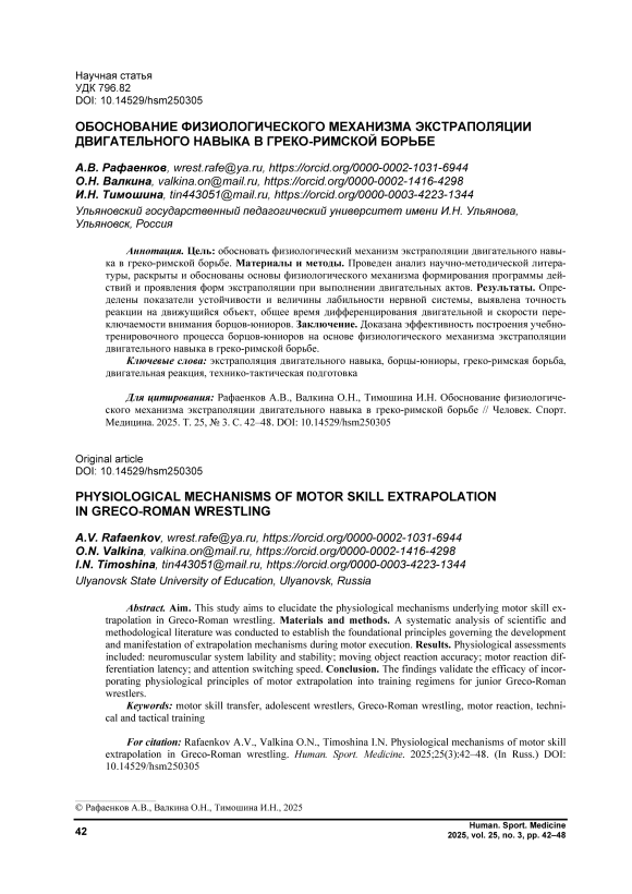 Обоснование физиологического механизма экстраполяции двигательного навыка в греко-римской борьбе
