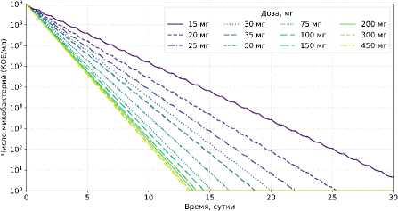 На рисунке 9 представлена динамика внеклеточной бактериальной популяции при ингаляционном введении изониазида в диапазоне доз 15–450 мг (РФ = 0,6) при ежедневном дозировании в течение 30 суток. Диапазон доз выбран исходя из данных клинических исследований и дополнен промежуточными значениями [6].