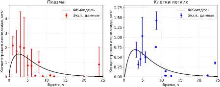 Оптимизацию параметров проводили методом scipy.optimize.minimize (SciPy). Получены следующие значения: ka = 0,57 ч-1, kel = 0,44 ч-1, k12 = 4,0 ч-1, k21 = 7,1 ч-1, k23 = 9,266 ч-1; k32 = 11,276 ч-1; Vplasma = 51,3 л; VЛЖ = 49,9 л; VКЛ = 53,7 л. На рисунке 2 приведено сопоставление фармакокинетической модели с клиническими данными: концентрация изониазида в плазме и клетках легких после перорального введения 300 мг изониазида.