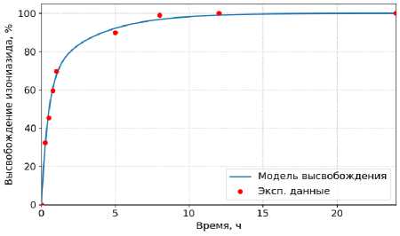 На рисунке 4 показано сопоставление расчётной кривой высвобождения изониазида с экспериментальными данными in vitro .