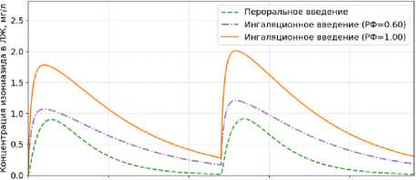 Для сопоставления эффективности перорального и ингаляционного путей введения выполнено совместное ФК/ФД (фармакокинетическое / фармакодинамическое) моделирование при следующем режиме терапии: ежедневное введение 300 мг изониазида 1 раз в сутки. Для перорального пути доля доставленного препарата принята равной 1. Для ингаляционного введения рассмотрены два сценария осаждения в легких: респирабельная фракция составляет 60% (РФ = 0,6), что соответствует литературным данным о доле препарата, достигающего альвеол [10]; доставка полной дозы (РФ = 1).