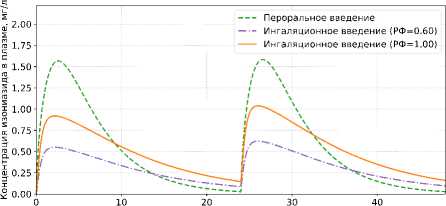 Рисунок 7. Концентрация изониазида в плазме при ежедневном дозировании 300 мг в течение 48 ч: сравнение перорального и ингаляционного введения (РФ = 0,6; РФ = 1)