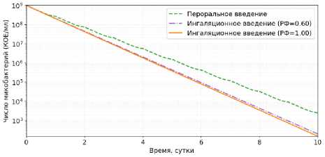 На рисунке 8 приведены результаты вычислительного эксперимента 10-дневной терапии с ежедневным введением 300 мг изониазида 1 раз в сутки, которые подтверждают преимущество ингаляционного введения: снижение бактериальной нагрузки происходит быстрее, независимо от доли респирабельной фракции препарата.