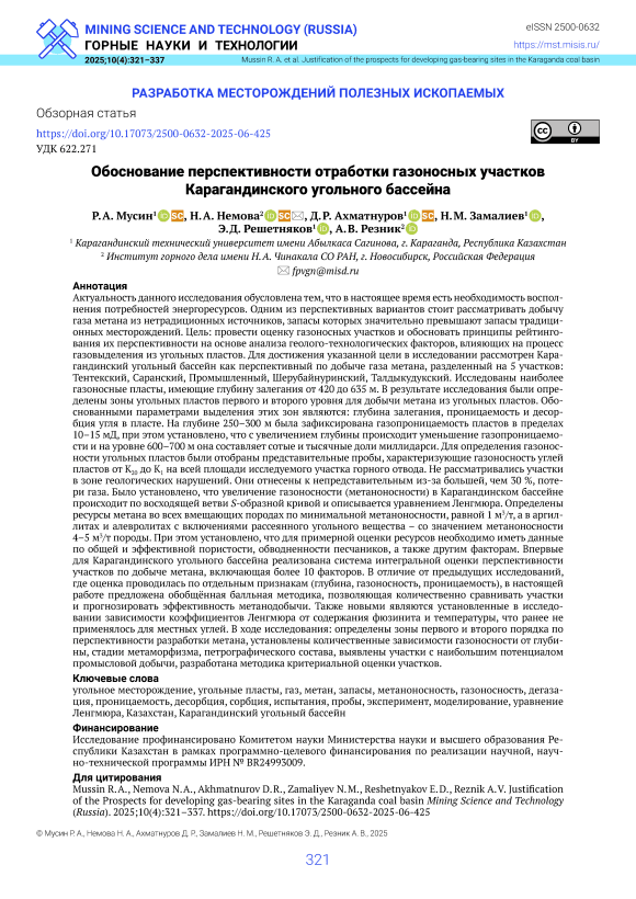 Актуальность данного исследования обусловлена тем, что в настоящее время есть необходимость восполнения потребностей энергоресурсов. Одним из перспективных вариантов стоит рассматривать добычу газа метана из нетрадиционных источников, запасы которых значительно превышают запасы традиционных месторождений. Цель: провести оценку газоносных участков и обосновать принципы рейтингования их перспективности на основе анализа геолого-технологических факторов, влияющих на процесс газовыделения из угольных пластов. Для достижения указанной цели в исследовании рассмотрен Карагандинский угольный бассейн как перспективный по добыче газа метана, разделенный на 5 участков: Тентекский, Саранский, Промышленный, Шерубайнуринский, Талдыкудукский. Исследованы наиболее газоносные пласты, имеющие глубину залегания от 420 до 635 м. В результате исследования были определены зоны угольных пластов первого и второго уровня для добычи метана из угольных пластов. Обоснованными параметрами выделения этих зон являются: глубина залегания, проницаемость и десорбция угля в пласте. На глубине 250–300 м была зафиксирована газопроницаемость пластов в пределах 10–15 мД, при этом установлено, что с увеличением глубины происходит уменьшение газопроницаемости и на уровне 600–700 м она составляет сотые и тысячные доли миллидарси. Для определения газоносности угольных пластов были отобраны представительные пробы, характеризующие газоносность углей пластов от К20 до К1 на всей площади исследуемого участка горного отвода. Не рассматривались участки в зоне геологических нарушений. Они отнесены к непредставительным из-за большей, чем 30 %, потери газа. Было установлено, что увеличение газоносности (метаноносности) в Карагандинском бассейне происходит по восходящей ветви S-образной кривой и описывается уравнением Ленгмюра. Определены ресурсы метана во всех вмещающих породах по минимальной метаноносности, равной 1 м3/т, а в аргиллитах и алевролитах с включениями рассеянного угольного вещества – со значением метаноносности 4–5 м3/т породы. При этом установлено, что для примерной оценки ресурсов необходимо иметь данные по общей и эффективной пористости, обводненности песчаников, а также другим факторам. Впервые для Карагандинского угольного бассейна реализована система интегральной оценки перспективности участков по добыче метана, включающая более 10 факторов. В отличие от предыдущих исследований, где оценка проводилась по отдельным признакам (глубина, газоносность, проницаемость), в настоящей работе предложена обобщённая балльная методика, позволяющая количественно сравнивать участки и прогнозировать эффективность метанодобычи. Также новыми являются установленные в исследовании зависимости коэффициентов Ленгмюра от содержания фюзинита и температуры, что ранее не применялось для местных углей. В ходе исследования: определены зоны первого и второго порядка по перспективности разработки метана, установлены количественные зависимости газоносности от глубины, стадии метаморфизма, петрографического состава, выявлены участки с наибольшим потенциалом промысловой добычи, разработана методика критериальной оценки участков.