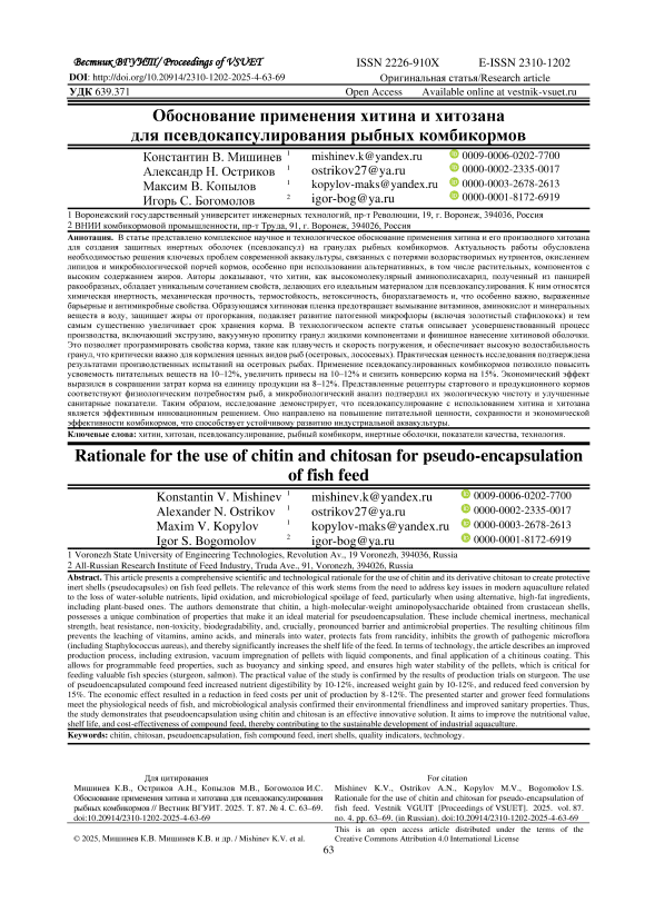 В статье представлено комплексное научное и технологическое обоснование применения хитина и его производного хитозана для создания защитных инертных оболочек (псевдокапсул) на гранулах рыбных комбикормов. Актуальность работы обусловлена необходимостью решения ключевых проблем современной аквакультуры, связанных с потерями водорастворимых нутриентов, окислением липидов и микробиологической порчей кормов, особенно при использовании альтернативных, в том числе растительных, компонентов с высоким содержанием жиров. Авторы доказывают, что хитин, как высокомолекулярный аминополисахарид, полученный из панцирей ракообразных, обладает уникальным сочетанием свойств, делающих его идеальным материалом для псевдокапсулирования. К ним относятся химическая инертность, механическая прочность, термостойкость, нетоксичность, биоразлагаемость и, что особенно важно, выраженные барьерные и антимикробные свойства. Образующаяся хитиновая пленка предотвращает вымывание витаминов, аминокислот и минеральных веществ в воду, защищает жиры от прогоркания, подавляет развитие патогенной микрофлоры (включая золотистый стафилококк) и тем самым существенно увеличивает срок хранения корма. В технологическом аспекте статья описывает усовершенствованный процесс производства, включающий экструзию, вакуумную пропитку гранул жидкими компонентами и финишное нанесение хитиновой оболочки. Это позволяет программировать свойства корма, такие как плавучесть и скорость погружения, и обеспечивает высокую водостабильность гранул, что критически важно для кормления ценных видов рыб (осетровых, лососевых). Практическая ценность исследования подтверждена результатами производственных испытаний на осетровых рыбах. Применение псевдокапсулированных комбикормов позволило повысить усвояемость питательных веществ на 10–12%, увеличить привесы на 10–12% и снизить конверсию корма на 15%. Экономический эффект выразился в сокращении затрат корма на единицу продукции на 8–12%. Представленные рецептуры стартового и продукционного кормов соответствуют физиологическим потребностям рыб, а микробиологический анализ подтвердил их экологическую чистоту и улучшенные санитарные показатели. Таким образом, исследование демонстрирует, что псевдокапсулирование с использованием хитина и хитозана является эффективным инновационным решением. Оно направлено на повышение питательной ценности, сохранности и экономической эффективности комбикормов, что способствует устойчивому развитию индустриальной аквакультуры.