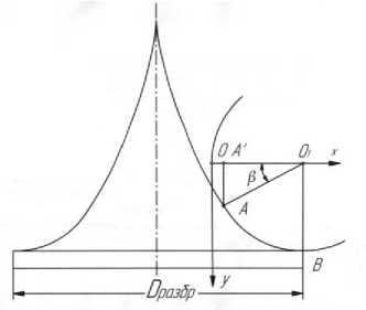 При этом проблема заключается в обосновании конструкции разбрасывателя и ее рациональном размещении в подсошниковом пространстве сошника. Поэтому, чтобы конструктивно разместить разбрасыватель в полости сошника, необходимо заменить образующую кривую с учетом расположения в ее нижнем конце кривой с меньшим радиусом кривизны, начиная с точки А (рис. 3).