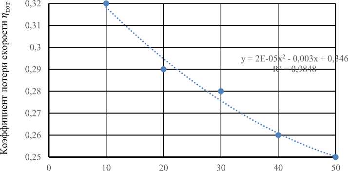 Из рисунка 4 видно, что с увеличением радиуса R коэффициент потери скорости // пот уменьшается. Но увеличение радиуса R ограничено размерами подсошникового пространства. Поэтому размер R ограничивается в пределах 25 - 30 мм, а потеря скорости скользящего по разбрасывателю зерна не превышает 30 % (рис. 5).