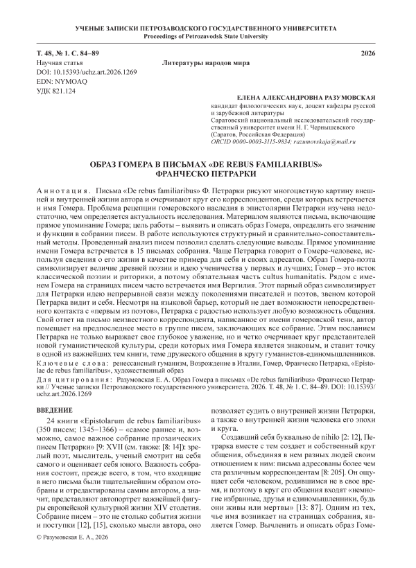 Письма «De rebus familiaribus» Ф. Петрарки рисуют многоцветную картину внешней и внутренней жизни автора и очерчивают круг его корреспондентов, среди которых встречается и имя Гомера. Проблема рецепции гомеровского наследия в эпистолярии Петрарки изучена недостаточно, чем определяется актуальность исследования. Материалом являются письма, включающие прямое упоминание Гомера; цель работы – выявить и описать образ Гомера, определить его значение и функции в собрании писем. В работе используются структурный и сравнительно-сопоставительный методы. Проведенный анализ писем позволил сделать следующие выводы. Прямое упоминание имени Гомера встречается в 15 письмах собрания. Чаще Петрарка говорит о Гомере-человеке, используя сведения о его жизни в качестве примера для себя и своих адресатов. Образ Гомера-поэта символизирует величие древней поэзии и идею ученичества у первых и лучших; Гомер – это исток классической поэзии и риторики, а потому обязательная часть cultus humanitatis. Рядом с именем Гомера на страницах писем часто встречается имя Вергилия. Этот парный образ символизирует для Петрарки идею непрерывной связи между поколениями писателей и поэтов, звеном которой Петрарка видит и себя. Несмотря на языковой барьер, который не дает возможности непосредственного контакта с «первым из поэтов», Петрарка с радостью использует любую возможность общения. Свой ответ на письмо неизвестного корреспондента, написанное от имени гомеровской тени, автор помещает на предпоследнее место в группе писем, заключающих все собрание. Этим посланием Петрарка не только выражает свое глубокое уважение, но и четко очерчивает круг представителей новой гуманистической культуры, среди которых имя Гомера является знаковым, и ставит точку в одной из важнейших тем книги, теме дружеского общения в кругу гуманистов-единомышленников.