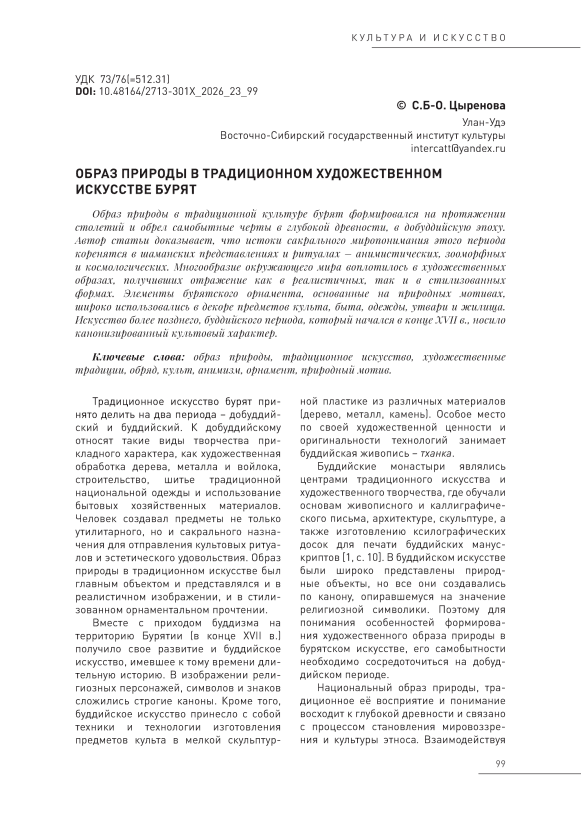 Образ природы в традиционной культуре бурят формировался на протяжении столетий и обрел самобытные черты в глубокой древности, в добуддийскую эпоху. Автор статьи доказывает, что истоки сакрального миропонимания этого периода коренятся в шаманских представлениях и ритуалах – анимистических, зооморфных и космологических. Многообразие окружающего мира воплотилось в художественных образах, получивших отражение как в реалистичных, так и в стилизованных формах. Элементы бурятского орнамента, основанные на природных мотивах, широко использовались в декоре предметов культа, быта, одежды, утвари и жилища. Искусство более позднего, буддийского периода, который начался в конце XVII в., носило канонизированный культовый характер.