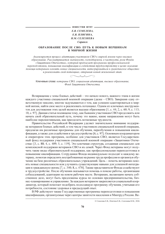 Анализируется процесс адаптации участников СВО к мирной жизни через высшее образование. Рассматривается значимость господдержки, в частности, роли Фонда «Защитники Отечества», который предлагает программы профессиональной переподготовки, повышения квалификации и содействия трудоустройству в целях оказания помощи ветеранам освоить новые специальности, интегрироваться в гражданское общество и реализовать свой потенциал, открывая новый жизненный этап.