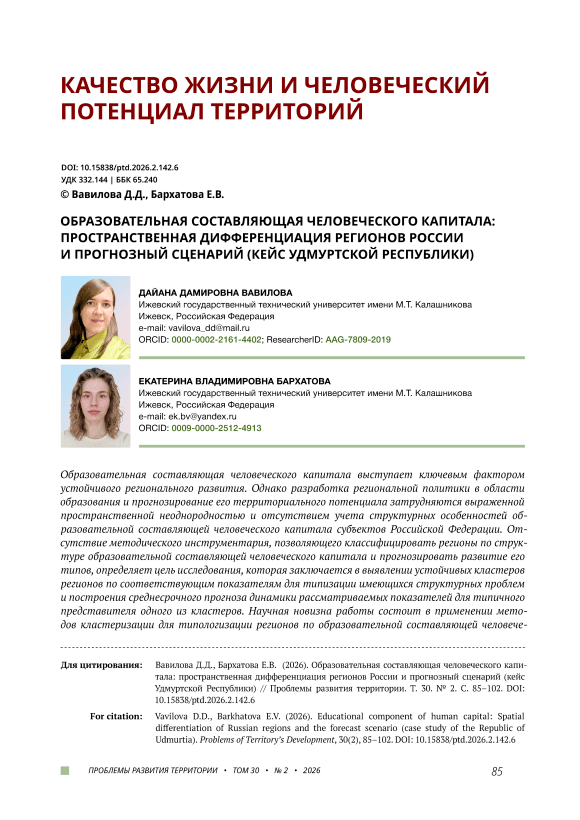 Образовательная составляющая человеческого капитала выступает ключевым фактором устойчивого регионального развития. Однако разработка региональной политики в области образования и прогнозирование его территориального потенциала затрудняются выраженной пространственной неоднородностью и отсутствием учета структурных особенностей образовательной составляющей человеческого капитала субъектов Российской Федерации. Отсутствие методического инструментария, позволяющего классифицировать регионы по структуре образовательной составляющей человеческого капитала и прогнозировать развитие его типов, определяет цель исследования, которая заключается в выявлении устойчивых кластеров регионов по соответствующим показателям для типизации имеющихся структурных проблем и построения среднесрочного прогноза динамики рассматриваемых показателей для типичного представителя одного из кластеров. Научная новизна работы состоит в применении методов кластеризации для типологизации регионов по образовательной составляющей человеческого капитала и прогнозного моделирования развития типичного представителя кластера. Кластеризация проведена с помощью двух методов: k-средних и иерархического (метод Уорда) с последующей проверкой согласованности результатов с использованием скорректированного индекса Рэнда (ARI). В ходе кластерного анализа выявлено пять гомогенных групп субъектов Российской Федерации с разной структурой образовательной составляющей человеческого капитала: образовательные центры страны, регионы с преобладанием высшего, среднего профессионального и общего образования, а также регионы с дефицитом профессионального образования. Для типичного представителя третьего кластера (Удмуртская Республика) построены прогнозы шести показателей до 2030 года с высокой точностью (средняя относительная ошибка ≤ 5,3%). Установлено, что в регионе ожидается усиление специализации подготовки кадров среднего звена (рост доли обучающихся в организациях среднего профессионального образования до 38,9‰). Для дальнейших исследований предлагается включить показатели, характеризующие результативность образовательных систем в рамках выделенных кластеров, и провести анализ межкластерной динамики образовательной составляющей человеческого капитала с целью формирования дифференцированных рекомендаций для региональной образовательной политики.