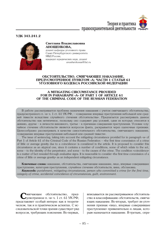 Смягчающее обстоятельство, предусмотренное п. «а» ч. 1 ст. 61 УК РФ, представляет особый интерес как в теоретическом, так и в практическом аспектах. С исследовательской точки зрения существует ряд вопросов, требующих пояснения. Во-первых, вписывается ли рассматриваемое обстоятельство в классификацию обстоятельств, смягчающих наказание. Во-вторых, требует ли уточнения признак «лицо, впервые совершившее преступление» применительно к лицам, которым назначается наказание. В-третьих, опре- деление категории преступления по фактически совершенному преступлению (чч. 2 или 3 ст. 15 УК РФ) или с учетом ч. 6 ст. 15 УК РФ. В-четвертных, что следует понимать под случайным стечением обстоятельств совершения преступления как одним из условий смягчения наказания.