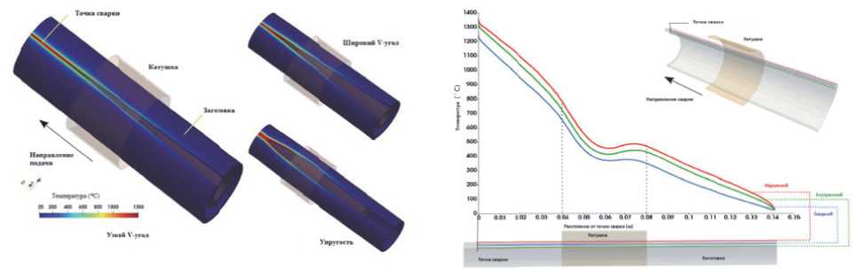 В [6] проведена оптимизация параметров процесса высокочастотной индукционной сварки и проанализированы причины возникновения дефектов сварки. Установлено, что под действием скин-эффекта распределение температуры при разных углах схождения в электромагнитном поле при одинаковой частоте тока индуктора имеет форму цилиндра, но чем меньше угол, тем выше эффективность нагрева и тем быстрее поднимается температура. В электромагнитном поле с различными частотами тока более высокая частота тока может ускорить нагрев, однако увеличение толщины стенки может привести к дефектам сварки. Регулируя два параметра угол схождения и частоту тока, было проверено, что результаты численного моделирования соответствуют экспериментальным данным.