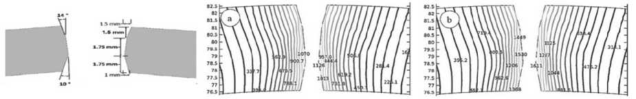 В [7] исследовано влияние геометрии кромки заготовки. Рассматривались три образца из стального листа марки L 210 с разными видами геометрии кромок (рисунок 2). Посредством конечно-элементного моделирования в программе Comsol, исследовано распределение температуры на кромках при формообразовании и сварке труб диаметром 165,2 мм. Параметры сварки (сила тока, частота тока и скорость движения) принимали постоянными. На основании изотермических диаграмм, установлено, что наилучшие формы кромок В и С (рисунок 3), которые обеспечивают наименьший температурный градиент. Таким образом, за счёт изменения формы кромок можно уменьшить ширину сварного шва, снизить температурный градиент, уменьшить зону термического воздействия.