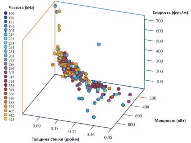 В [10] проведён анализ взаимного влияния частоты тока, мощности тока, скорости линии и химического состава стали на качество сварного шва при высокочастотной индукционной сварке. Данные для исследования были получены от 92 предприятий по всему миру и охватили широкий диапазон марок сталей (от HSLA до легированной стали), а области применения включали трубы, в т.ч. холодильные и автомобильные компоненты, профили и т.д.. Диаграмма на рисунке 4 иллюстрирует тенденцию к использованию меньшей мощности при более высоких скоростях линии и более тонких стенках, но по мере увеличения толщины стенок разброс данных значительно увеличивается.