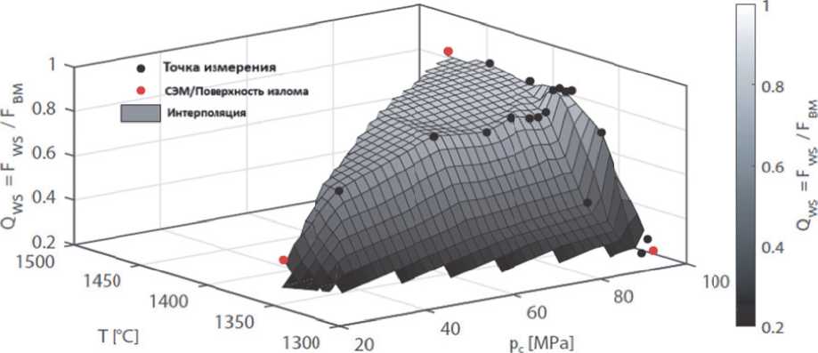 Рисунок 5 - Зависимость коэффициента прочности сварного шва Qws от температуры T и контактного нормального напряжения pc при высокочастотной сварке стали 34MnB5 [16]