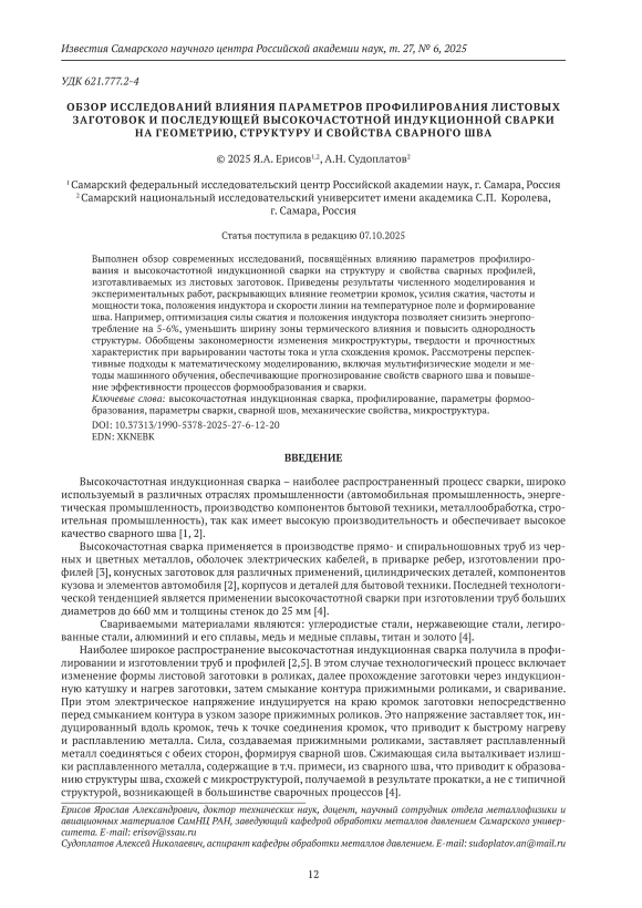 Выполнен обзор современных исследований, посвящённых влиянию параметров профилирования и высокочастотной индукционной сварки на структуру и свойства сварных профилей, изготавливаемых из листовых заготовок. Приведены результаты численного моделирования и экспериментальных работ, раскрывающих влияние геометрии кромок, усилия сжатия, частоты и мощности тока, положения индуктора и скорости линии на температурное поле и формирование шва. Например, оптимизация силы сжатия и положения индуктора позволяет снизить энергопотребление на 5-6%, уменьшить ширину зоны термического влияния и повысить однородность структуры. Обобщены закономерности изменения микроструктуры, твердости и прочностных характеристик при варьировании частоты тока и угла схождения кромок. Рассмотрены перспективные подходы к математическому моделированию, включая мультифизические модели и методы машинного обучения, обеспечивающие прогнозирование свойств сварного шва и повышение эффективности процессов формообразования и сварки.
