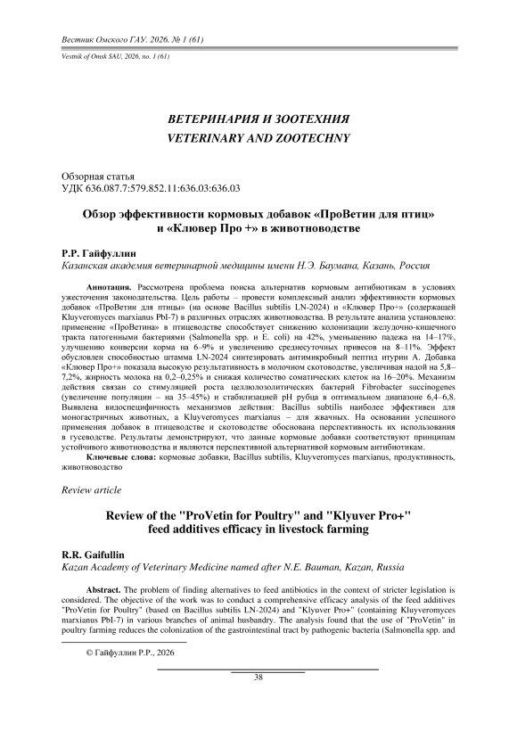 Рассмотрена проблема поиска альтернатив кормовым антибиотикам в условиях ужесточения законодательства. Цель работы – провести комплексный анализ эффективности кормовых добавок «ПроВетин для птицы» (на основе Bacillus subtilis LN-2024) и «Клювер Про+» (содержащей Kluyveromyces marxianus PbI-7) в различных отраслях животноводства. В результате анализа установлено: применение «ПроВетина» в птицеводстве способствует снижению колонизации желудочно-кишечного тракта патогенными бактериями (Salmonella spp. и E. coli) на 42%, уменьшению падежа на 14–17%, улучшению конверсии корма на 6–9% и увеличению среднесуточных привесов на 8–11%. Эффект обусловлен способностью штамма LN-2024 синтезировать антимикробный пептид итурин А. Добавка «Клювер Про+» показала высокую результативность в молочном скотоводстве, увеличивая надой на 5,8–7,2%, жирность молока на 0,2–0,25% и снижая количество соматических клеток на 16–20%. Механизм действия связан со стимуляцией роста целлюлозолитических бактерий Fibrobacter succinogenes (увеличение популяции – на 35–45%) и стабилизацией pH рубца в оптимальном диапазоне 6,4–6,8. Выявлена видоспецифичность механизмов действия: Bacillus subtilis наиболее эффективен для моногастричных животных, а Kluyveromyces marxianus – для жвачных. На основании успешного применения добавок в птицеводстве и скотоводстве обоснована перспективность их использования в гусеводстве. Результаты демонстрируют, что данные кормовые добавки соответствуют принципам устойчивого животноводства и являются перспективной альтернативой кормовым антибиотикам.