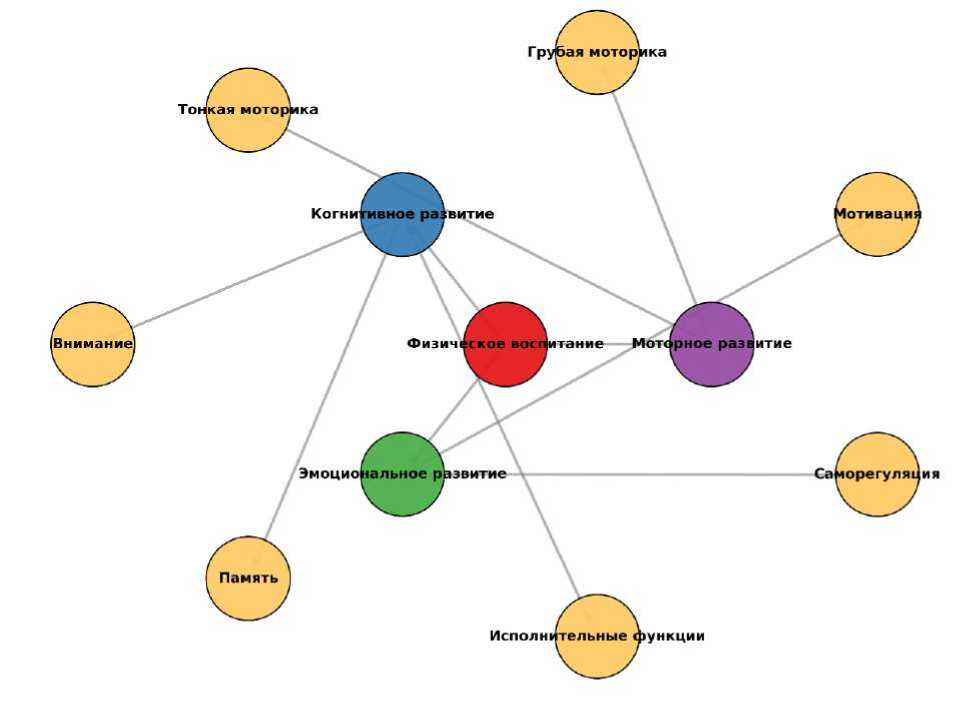 В её центре представлено физическое воспитание, воздействующее одновременно на когнитивную, эмоциональную и моторную сферы. Схема показывает, что двигательная активность стимулирует развитие внимания, памяти и исполнительных функций, формирует саморегуляцию и мотивацию, а также совершенствует грубую и тонкую моторику. Таким образом, физическое воспитание выступает связующим звеном, объединяющим разные линии развития ребёнка в целостную систему.