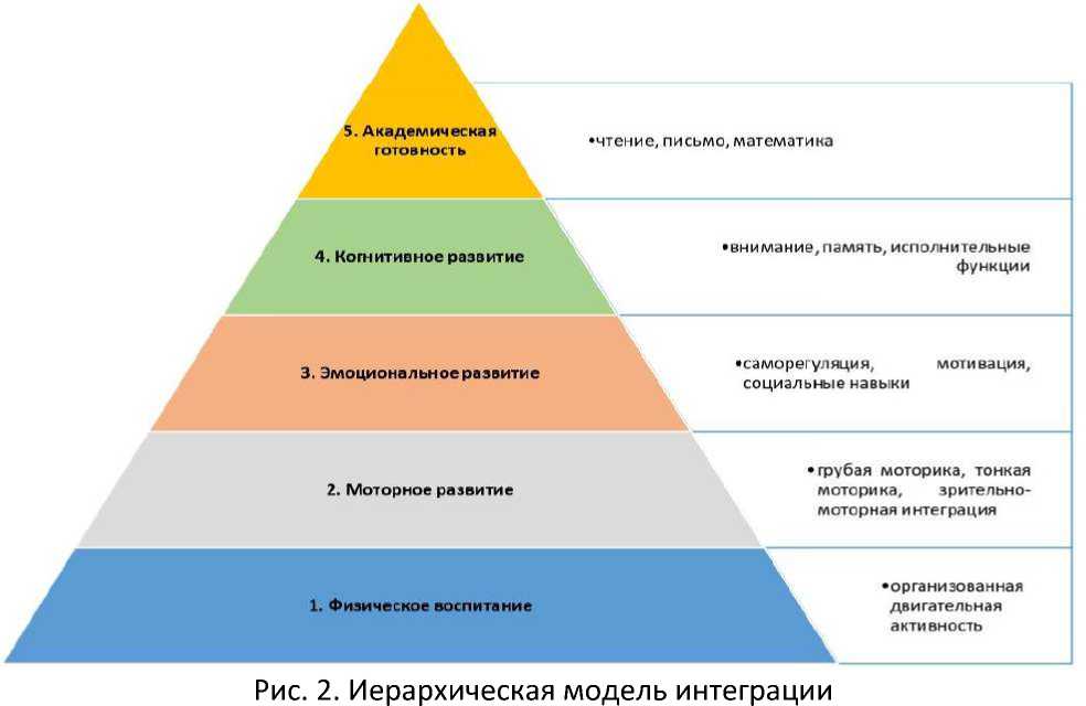 Системность взаимодействия психического и физического развития можно представить в виде пирамиды. Её основание составляет физическое воспитание, формирующее базу для моторного развития. На втором уровне находятся грубая и тонкая моторика, а также зрительно-моторная интеграция. На третьем уровне располагается эмоциональное развитие, включающее саморегуляцию и социальные навыки. Четвёртый уровень образуют когнитивные функции — внимание, память, исполнительные процессы. На вершине пирамиды находится академическая готовность, выражающаяся в способности ребёнка овладевать чтением, письмом и математикой. Структура пирамиды отражает иерархичность взаимодействия сфер развития, где физическое воспитание рассматривается как фундамент, обеспечивающий согласованное формирование различных уровней (рис.2).