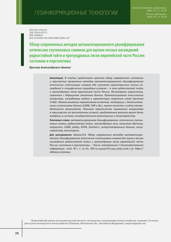 В статье представлен краткий обзор современного состояния и перспектив применения методов автоматизированного дешифрирования оптических спутниковых снимков для получения характеристик лесных на‑ саждений в специфических природных условиях – в зоне редкостойной тайги и притундровых лесов европейской части России. Рассмотрены ограничения, связанные с дефицитом эталонных данных. Проанализированы классические алгоритмы, ансамблевые модели и архитектуры нейронных сетей (включая U‑Net). Уделено внимание нормативным аспектам, интеграции с дополнитель‑ ными источниками данных (LiDAR, SAR и др.), оценке качества и учёту неопре‑ делённости результатов. Показано практическое применение алгоритмов в зависимости от региональных условий; предложенные решения могут быть внедрены в системы государственного мониторинга и лесоустройства.