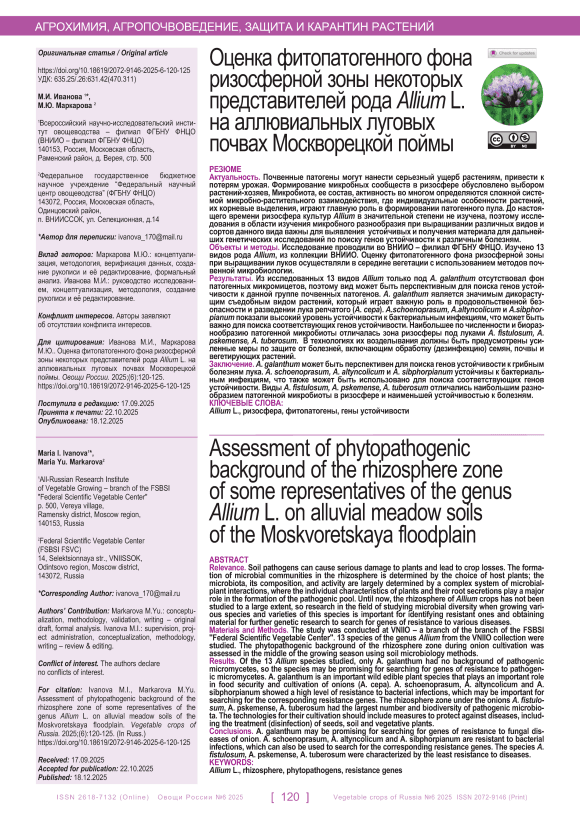 Актуальность. Почвенные патогены могут нанести серьезный ущерб растениям, привести к потерям урожая. Формирование микробных сообществ в ризосфере обусловлено выбором растений-хозяев, Микробиота, ее состав, активность во многом определяются сложной системой микробно-растительного взаимодействия, где индивидуальные особенности растений, их корневые выделения, играют главную роль в формировании патогенного пула. До настоящего времени ризосфера культур Allium в значительной степени не изучена, поэтому исследования в области изучения микробного разнообразия при выращивании различных видов и сортов данного вида важны для выявления устойчивых и получения материала для дальнейших генетических исследований по поиску генов устойчивости к различным болезням. Объекты и методы. Исследование проводили во ВНИИО – филиал ФГБНУ ФНЦО. Изучено 13 видов рода Allium, из коллекции ВНИИО. Оценку фитопатогенного фона ризосферной зоны при выращивании луков осуществляли в середине вегетации с использованием методов почвенной микробиологии. Результаты. Из исследованных 13 видов Allium только под А. galanthum отсутствовал фон патогенных микромицетов, поэтому вид может быть перспективным для поиска генов устойчивости к данной группе почвенных патогенов. A. galanthum является значимым дикорастущим съедобным видом растений, который играет важную роль в продовольственной безопасности и разведении лука репчатого (A. cepa). А.schoenoprasum, А.altyncolicum и А.sibphorpianum показали высокий уровень устойчивости к бактериальным инфекциям, что может быть важно для поиска соответствующих генов устойчивости. Наибольшее по численности и биоразнообразию патогенной микробиоты отличалась зона ризосферы под луками А. fistulosum, А. pskemense, А. tuberosum. В технологиях их возделывания должны быть предусмотрены усиленные меры по защите от болезней, включающим обработку (дезинфекцию) семян, почвы и вегетирующих растений. Заключение. A. galanthum может быть перспективен для поиска генов устойчивости к грибным болезням лука. А. schoenoprasum, А. altyncolicum и А. sibphorpianum устойчивы к бактериальным инфекциям, что также может быть использовано для поиска соответствующих генов устойчивости. Виды А. fistulosum, А. pskemense, А. tuberosum отличались наибольшим разнообразием патогенной микробиоты в ризосфере и наименьшей устойчивостью к болезням.