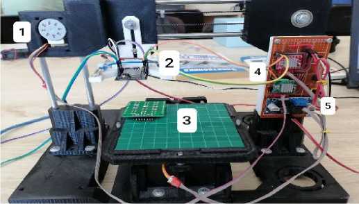 На первом этапе был создан экспериментальный стенд для оптического контроля на основе машинного обучения. Конструкция стенда представляет собой комплекс следующих модулей: Шаговые двигатели и подвижный стол для сканируемой платы (номера 1 и 3 на рисунке 1), модуль ESP32-CAM (номер 2 на рисунке 1), драйвера для управления шаговыми двигателями на микросхеме А4988 и понижающий DC-DC преобразователь (номера 4 и 5 на рисунке 1).