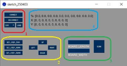 Для получения каких-либо данных при сканировании печатной платы была разработана программа для взаимодействия с персональным компьютером. Возможности программы: подключение ПК к макету (область 1 на рисунке 2), ручное управление макетом и ввод данных печатной платы (области 2 и 3 на рисунке 2), вывод информации в виде массивов (область 4 на рисунке 2).