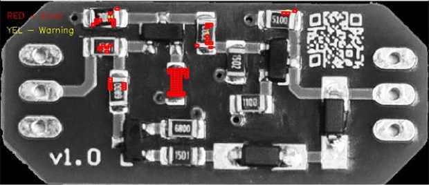 Классический алгоритмический подход на основе OpenCV, при всей его относительной простоте в разработке, демонстрирует критичные для промышленного применения недостатки. Он требует трудоемкой ручной настройки параметров допустимого порога под каждый новый тип изделия и оказывается чрезмерно чувствительным к естественным производственным вариациям, что ведет к большому числу ложных срабатываний. Применение данного метода к визуальному контролю монтажа радиоэлектронных компонентов считаем не целесообразным, однако возможно применение к контролю топологии печатных плат.
