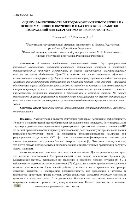 В статье представлен сравнительный анализ двух принципиально различных методологий автоматизированного оптического контроля в контексте производственных процессов электроники, а именно классического алгоритмического подхода на основе библиотеки OpenCV и подхода на основе машинного обучения с использованием платформы Edge Impulse. Исследование сфокусировано на задаче инспекции монтажа радиоэлектронных компонентов на печатных платах. Цель работы – провести объективную оценку эффективности каждого из методов по ключевым для промышленного внедрения критериям, таких как: точность детектирования, скорость проверки, а также трудоемкость разработки, настройки и требованиям к исходным данным. На основе проведенного анализа формируются практические рекомендации по выбору оптимального подхода в зависимости от конкретных условий производственного процесса и поставленных задач.