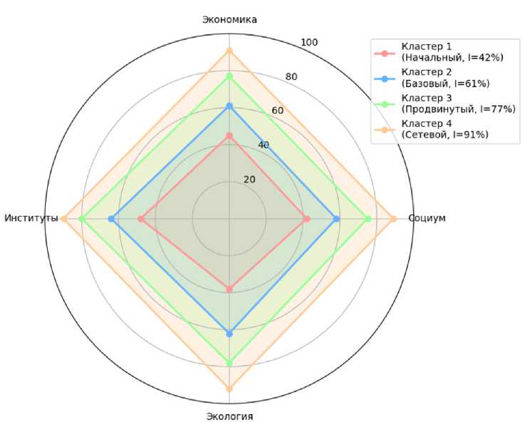 Полученный коэффициент β₁ = 0,42 подтверждает, что каждый условный «шаг» в цифровизации приводит к существенному росту общей управленческой эффективности, даже с учетом региональной специфики, присущей модельному региону (в нашем случае им явилась Новосибирская область). Визуализация данных в виде радар-диаграммы (см. рисунок) демонстрирует сбалансированность развития по направлениям у лидеров (Кластер 4) и выраженные диспропорции у аутсайдеров (Кластер 1), где особенно отстают экологические и институциональные показатели.