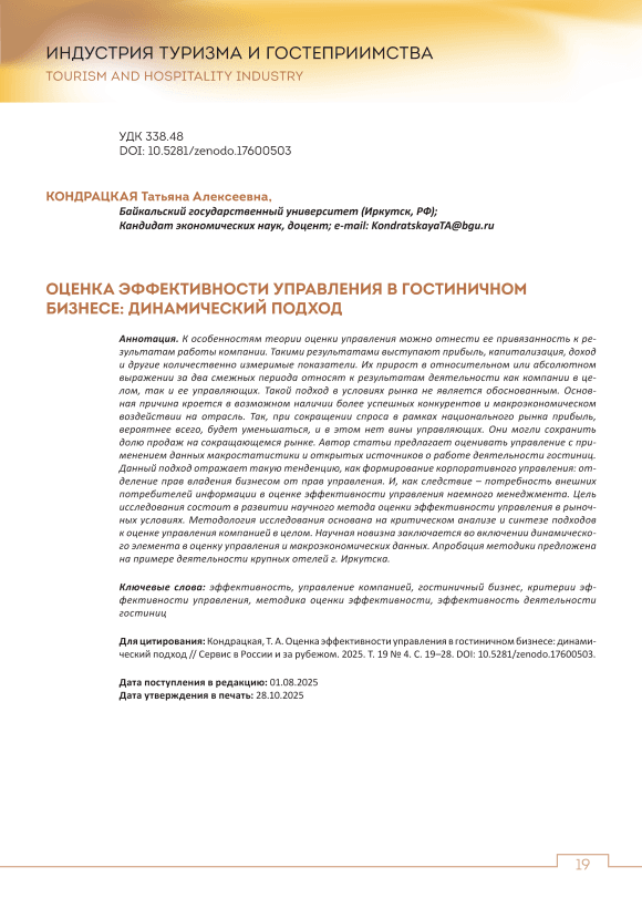 К особенностям теории оценки управления можно отнести ее привязанность к результатам работы компании. Такими результатами выступают прибыль, капитализация, доход и другие количественно измеримые показатели. Их прирост в относительном или абсолютном выражении за два смежных периода относят к результатам деятельности как компании в целом, так и ее управляющих. Такой подход в условиях рынка не является обоснованным. Основная причина кроется в возможном наличии более успешных конкурентов и макроэкономическом воздействии на отрасль. Так, при сокращении спроса в рамках национального рынка прибыль, вероятнее всего, будет уменьшаться, и в этом нет вины управляющих. Они могли сохранить долю продаж на сокращающемся рынке. Автор статьи предлагает оценивать управление с применением данных макростатистики и открытых источников о работе деятельности гостиниц. Данный подход отражает такую тенденцию, как формирование корпоративного управления: отделение прав владения бизнесом от прав управления. И, как следствие – потребность внешних потребителей информации в оценке эффективности управления наемного менеджмента. Цель исследования состоит в развитии научного метода оценки эффективности управления в рыночных условиях. Методология исследования основана на критическом анализе и синтезе подходов к оценке управления компанией в целом. Научная новизна заключается во включении динамического элемента в оценку управления и макроэкономических данных. Апробация методики предложена на примере деятельности крупных отелей г. Иркутска.