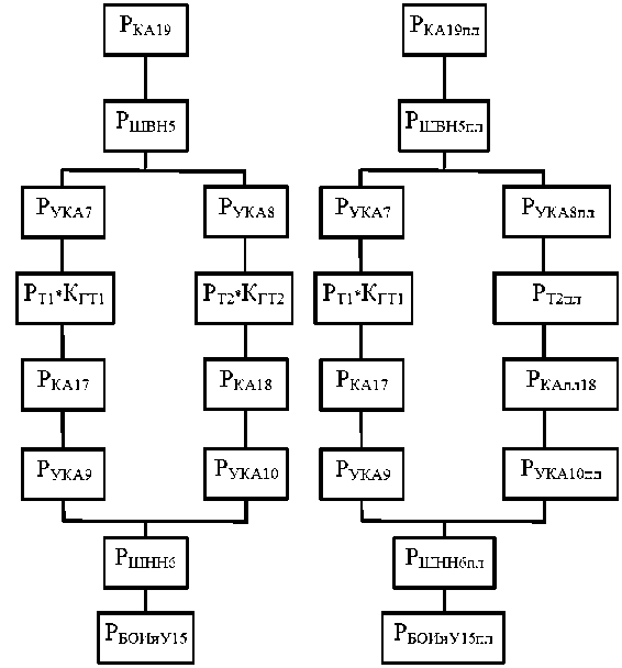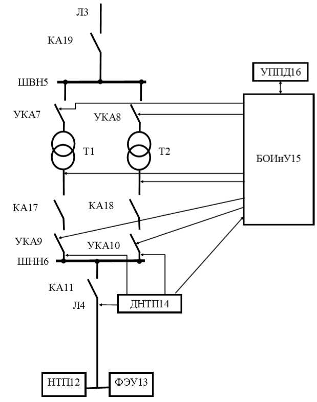 На рис. 1 показана структурная схема реализации способа замены одного СТ на два (Способ., 2023). Схема содержит: Т1, Т2 - силовые трансформаторы, Л3 - питающая линия; Л4 - отходящая линия; ШВН5 -шины высокого напряжения; ШНН6 - шины низкого напряжения; УКА7, УКА8 - управляемые коммутационные аппараты высокого напряжения (например, вакуумные выключатели); УКА9, УКА10 -управляемые коммутационные аппараты низкого напряжения (например, вакуумные контакторы); КА11 -коммутационный аппарат отходящей линии (автоматический выключатель); НТП12 - нагрузка трансформаторной подстанции; ФЭУ13 – фотоэлектрическая установка (может отсутствовать на практике, в расчетах надежности не учитывалась); ДНТП14 – датчик нагрузки трансформаторной подстанции; БОИиУ15 – блок обработки информации и управления; УППД16 – устройство приема и передачи данных; КА17, КА18 – коммутационные аппараты низкого напряжения (рубильники) (Способ…, 2023; Виноградова и др., 2023).
