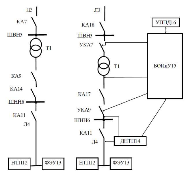 В схеме на рис. 2, а в качестве коммутационного аппарата на стороне высокого напряжения (ВН) применяется разъединитель КА7, на стороне низкого напряжения – рубильник КА9 и автоматический выключатель КА14 на вводе и автоматический выключатель КА11 на отходящей линии. На рис. 2, б в качестве коммутационных аппаратов на стороне ВН применяется разъединитель КА18 и вакуумный выключатель УКА7, на стороне низкого напряжения – рубильник КА17 и вакуумный контактор УКА9 на вводе, а также автоматический выключатель КА11 на отходящей линии. Схема на рис. 2, б оснащена блоком обработки информации и управления БОИиУ15, датчиком нагрузки трансформаторной подстанции ДНТП14, устройством приема и передачи данных УППД16. Блок БОИиУ15 осуществляет сбор данных и управление управляемыми коммутационными аппаратами УКА7 и УКА9 (Виноградова и др., 2023).