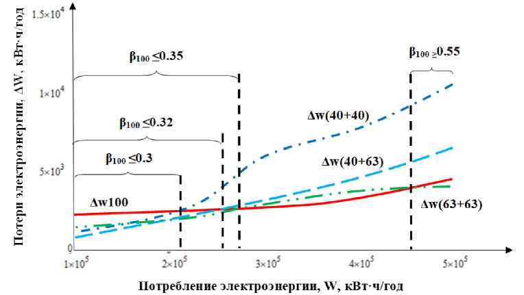 Рис. 3. Графики годовых потерь электроэнергии в СТ 100 кВА и устанавливаемых альтернативно ему СТ мощностью 40 и 40 кВА, 40 и 63 кВА, 63 и 63 кВА