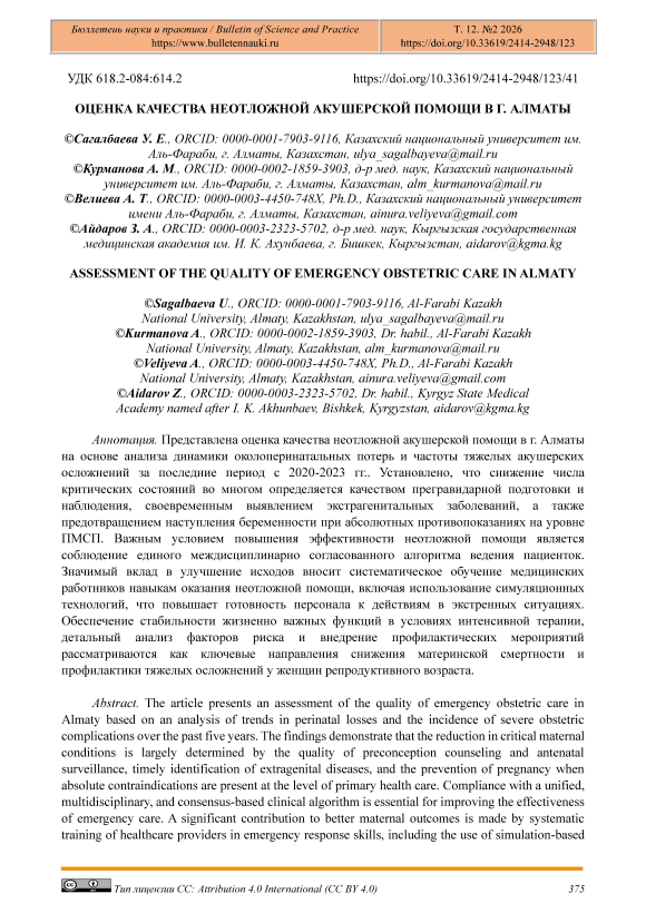 Представлена оценка качества неотложной акушерской помощи в г. Алматы на основе анализа динамики околоперинатальных потерь и частоты тяжелых акушерских осложнений за последние период с 2020-2023 гг.. Установлено, что снижение числа критических состояний во многом определяется качеством прегравидарной подготовки и наблюдения, своевременным выявлением экстрагенитальных заболеваний, а также предотвращением наступления беременности при абсолютных противопоказаниях на уровне ПМСП. Важным условием повышения эффективности неотложной помощи является соблюдение единого междисциплинарно согласованного алгоритма ведения пациенток. Значимый вклад в улучшение исходов вносит систематическое обучение медицинских работников навыкам оказания неотложной помощи, включая использование симуляционных технологий, что повышает готовность персонала к действиям в экстренных ситуациях. Обеспечение стабильности жизненно важных функций в условиях интенсивной терапии, детальный анализ факторов риска и внедрение профилактических мероприятий рассматриваются как ключевые направления снижения материнской смертности и профилактики тяжелых осложнений у женщин репродуктивного возраста.