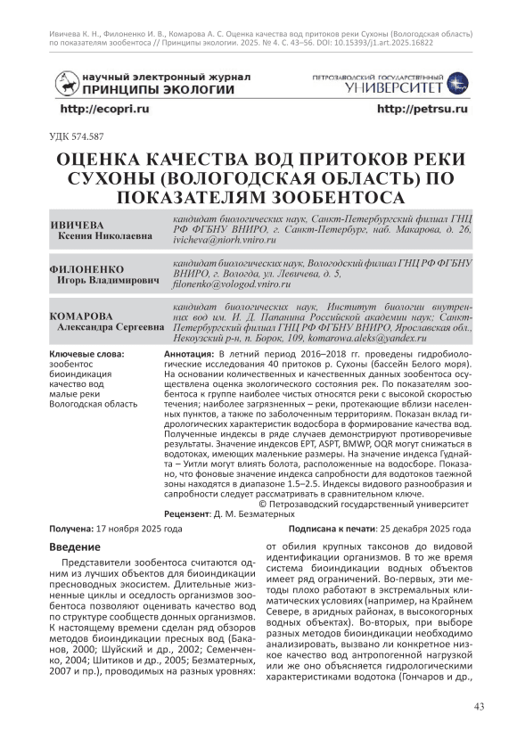 В летний период 2016–2018 гг. проведены гидробиологические исследования 40 притоков р. Сухоны (бассейн Белого моря). На основании количественных и качественных данных зообентоса осуществлена оценка экологического состояния рек. По показателям зообентоса к группе наиболее чистых относятся реки с высокой скоростью течения; наиболее загрязненных – реки, протекающие вблизи населенных пунктов, а также по заболоченным территориям. Показан вклад гидрологических характеристик водосбора в формирование качества вод. Полученные индексы в ряде случаев демонстрируют противоречивые результаты. Значение индексов EPT, ASPT, BMWP, OQR могут снижаться в водотоках, имеющих маленькие размеры. На значение индекса Гуднайта – Уитли могут влиять болота, расположенные на водосборе. Показано, что фоновые значение индекса сапробности для водотоков таежной зоны находятся в диапазоне 1.5–2.5. Индексы видового разнообразия и сапробности следует рассматривать в сравнительном ключе.